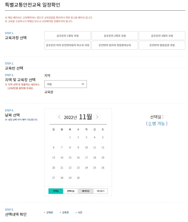 이곳에서는 총 5단계로 진행이 되게 됩니다. 대상자를 확인하여 교육장과 날짜를 선택하여 예약을 하면 끝인데요.
