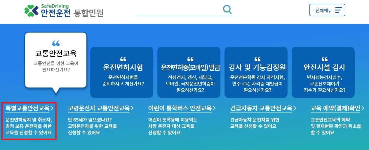 보시면 여러가지 메뉴들이 있는데요. 왼쪽 아래에 있는 특별교통안전교육 메뉴를 선택하여 들어가주시면 됩니다.