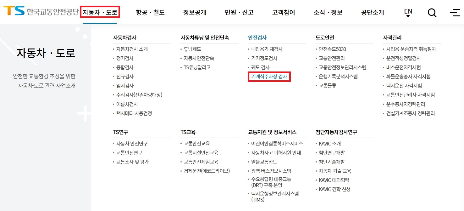 접속 후 이제 메뉴를 찾아줘야 해요. 제가 그림에 표시를 해둔 것처럼 기계식주차장 검사 메뉴를 찾아서 들어가주시면 됩니다.