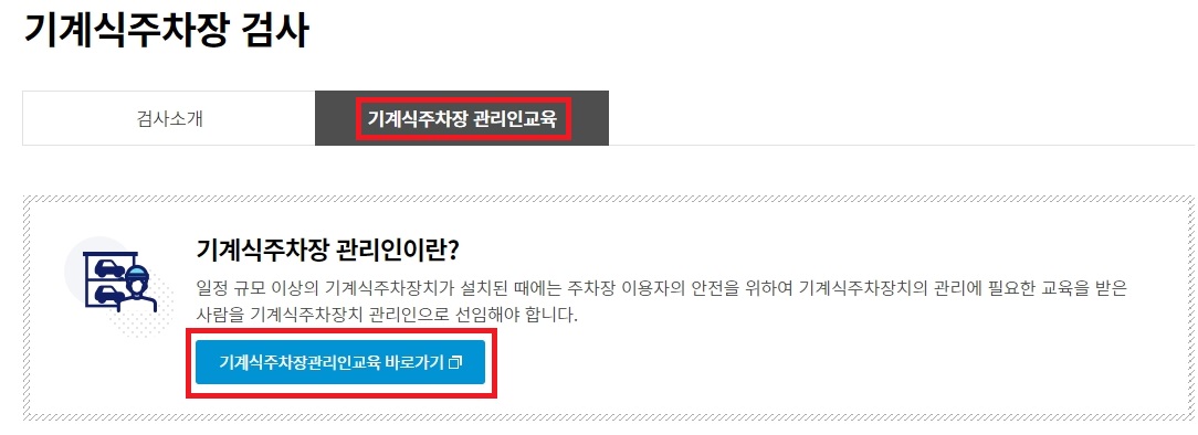 바로 이곳에서 기계식 주차장 관리인 교육 메뉴를 볼 수 있습니다. 기계식 주차장 관리인이라는것이 무엇인지 설명이 되어 있고, 교육 바로가기가 있는데요. 바로가기를 눌러주시면 됩니다.