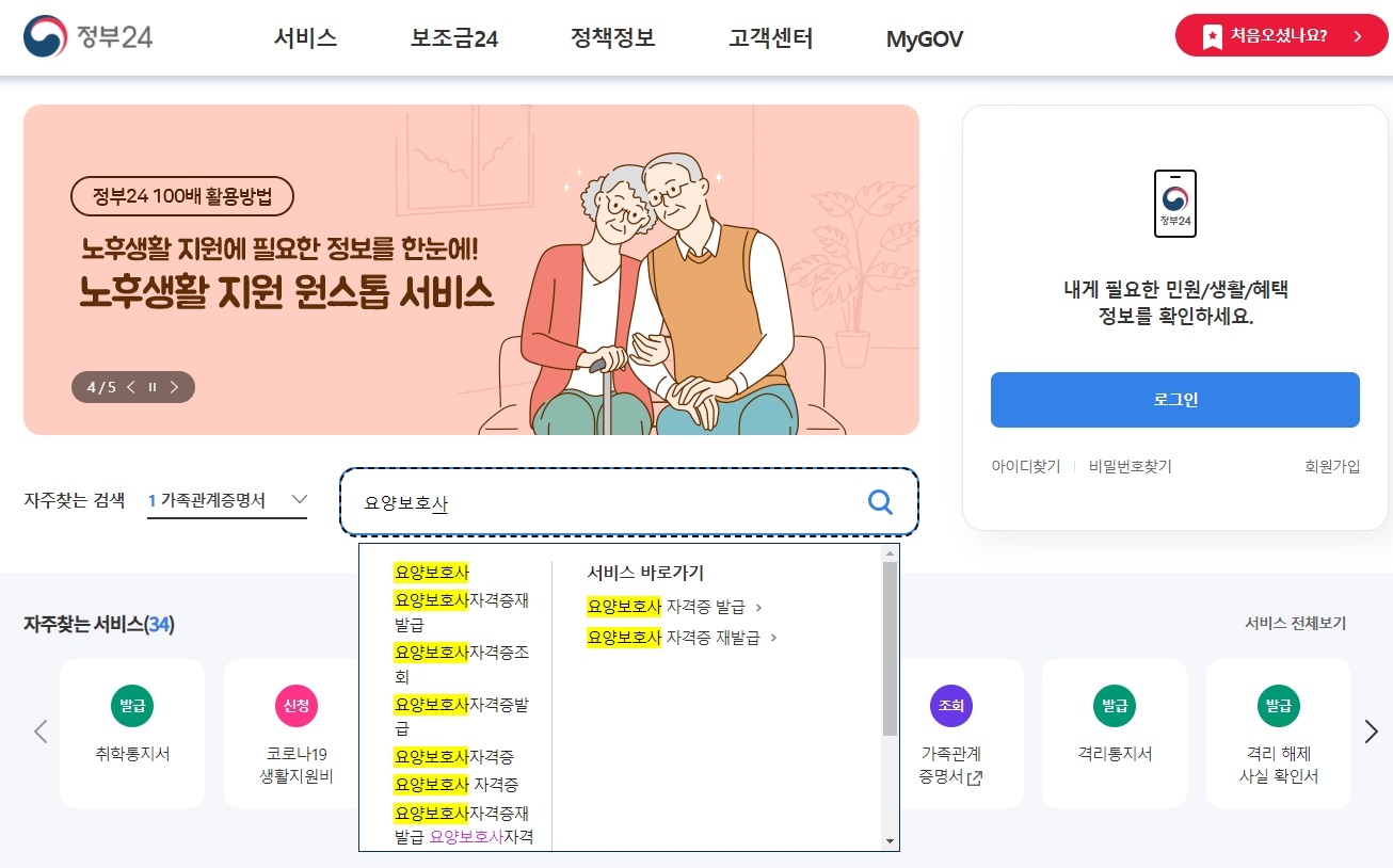 검색창에 요양보호사라고만 입력을 하면 자격증 발급 및 재발급에 대한 서비스 메뉴가 나오게 됩니다.