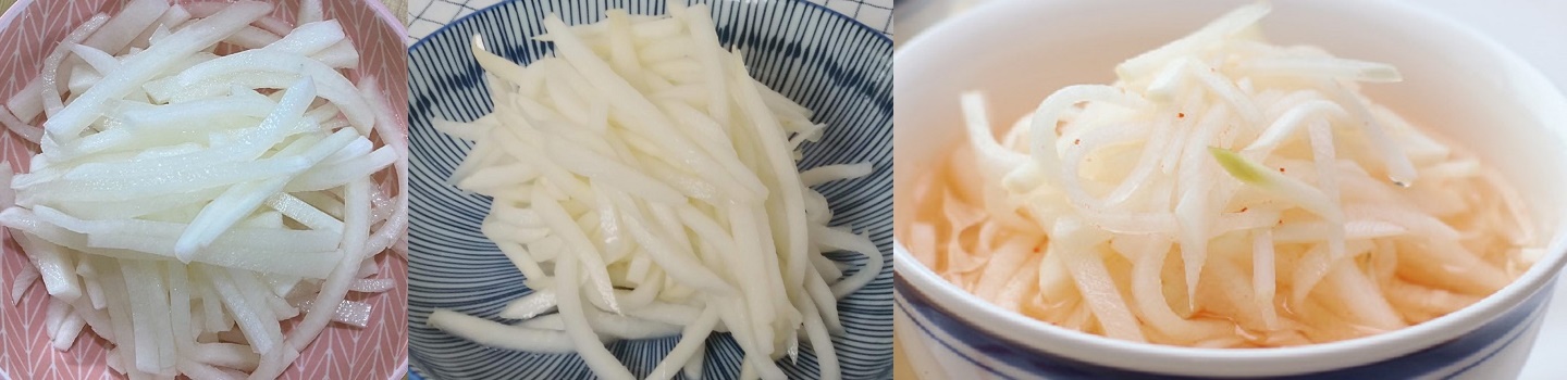 - 식초물에 담궈놨던 무가 30분이 지나면 뺀 뒤 물기를 제거해주시구요.