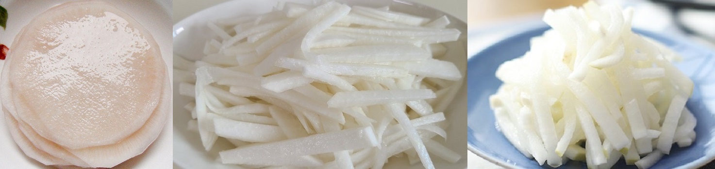 - 껍질 벗긴 무를 얇게 채 썰어주세요. 이 때 채칼을 이용하여 채를 썰어주시는게 편합니다. 만약 두꺼운 무초절임을 원하시면 두꺼운 채칼 혹은 칼을 이용하여 두껍게 썰어주시면 됩니다.