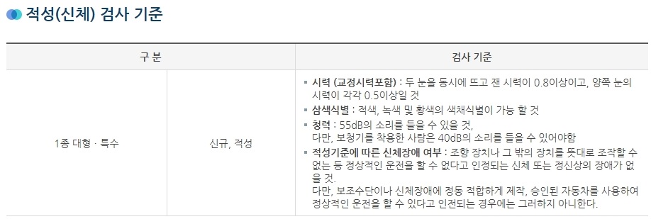 먼저 1종 대형과 특수입니다. 신규 및 적성검사 모두 동일하구요. 시력은 교정시력을 포함하여 두준을 동시에 뜨고 잰 시력이 0.8이상이어야 합니다. 양쪽 눈의 시력이 각각 0.5이상이면 됩니다.