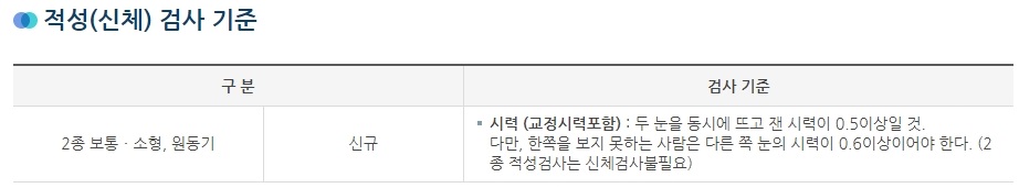 다음은 2종 보통 및 소형, 원동기 면허인데요. 교정시력을 포함하여 두 눈을 동시에 뜨고 잰 시력이 0.5이상이어야 합니다. 다만 한쪽을 보지 못하는 사람은 다른 쪽 눈의 시력이 0.6이상이어야 한다고 해요.