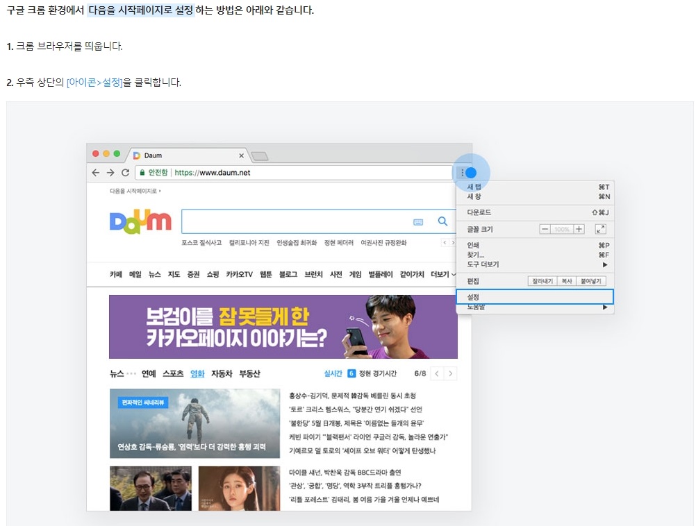 이렇듯 각 브라우저별 설정 방법을 참고하여 설정을 하시면 다음을 시작페이지로 사용하실 수 있게 될거에요.
