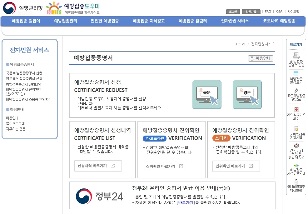 전자민원 서비스를 보시게 되면 예방접종 증명서라는 메뉴가 있는것을 볼 수 있어요.