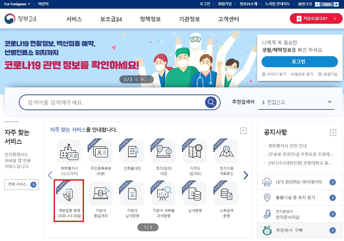 정부24를 이용한 코로나19 예방접종 증명서 인터넷발급 방법