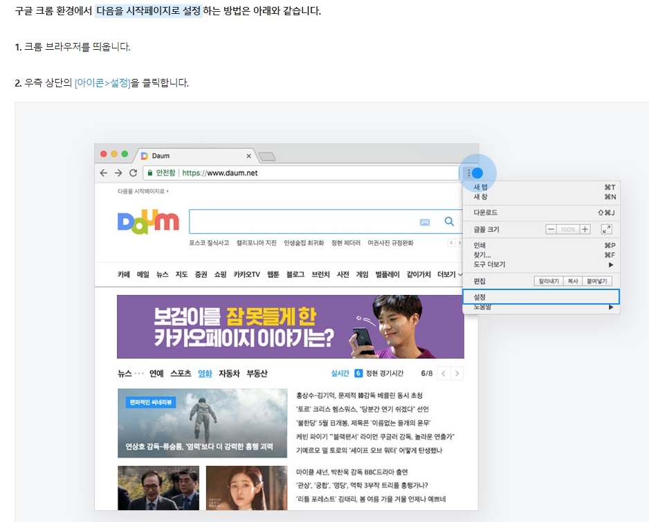 다음에 접속을 하시면 상단에 위와 같은 메뉴를 보실 수 있는데요. 시작페이지 설정을 어떻게 해야 하는가에 대해서 안내를 해주고 있습니다. 아마 메뉴가 작게 되어 있어서 못보신 분들도 많이 있으셨을겁니다.