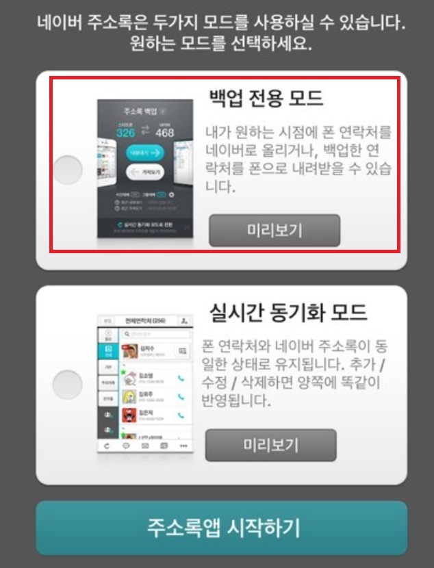 여기에서 백업 전용 모드를 이용하시면 폰 연락처를 네이버 서버로 옮기기도 하고, 반대로 서버에 백업한 연락처를 폰으로 받을수도 있어요.