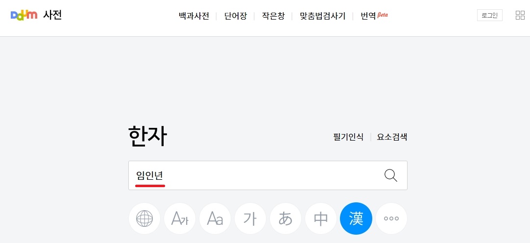 여기에서는 다양한 사전 서비스 이용이 가능한데요. 제가 선택해 놓은 메뉴를 선택해주시면 한자 사전 이용이 가능합니다.