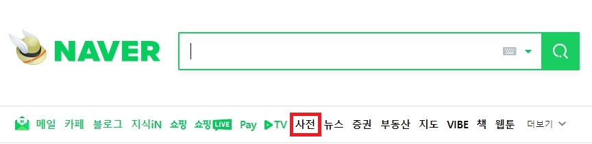 네이버에서 제공하고 있는 사전을 이용할거구요. 네이버 사전은 홈페이지 메인 화면에서 사전 메뉴를 통해서 들어가실 수 있습니다.