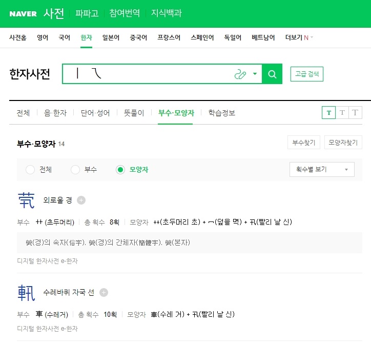 또한 부수를 통해서 찾아보시는것도 가능하구요.