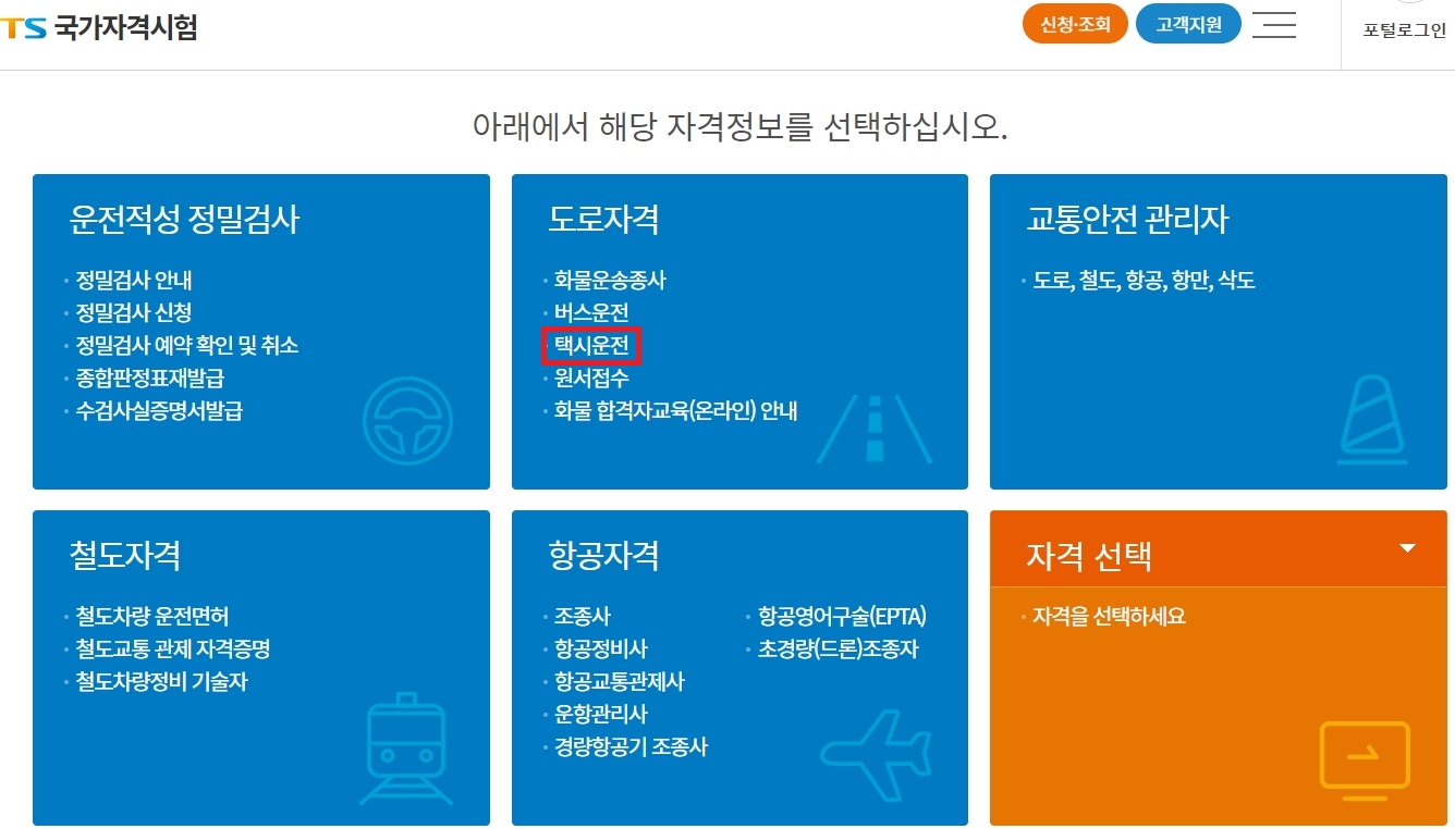 들어가시면 여러가지 자격들이 있는데요. 도로자격에 있는 택시운전 메뉴를 선택해줍니다.