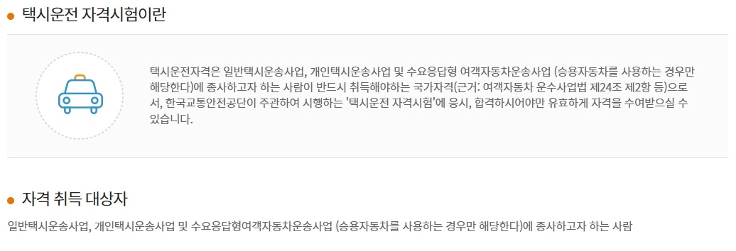 또한 사이트에서는 택시운전 자격시험에 대한 내용에 대해서도 안내를 해주고 있는데요. 잘 모르시는 분들은 한번 참고를 해보시면 좋겠네요.