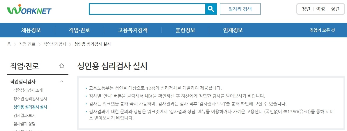 워크넷 직업심리검사(청소년 및 성인)