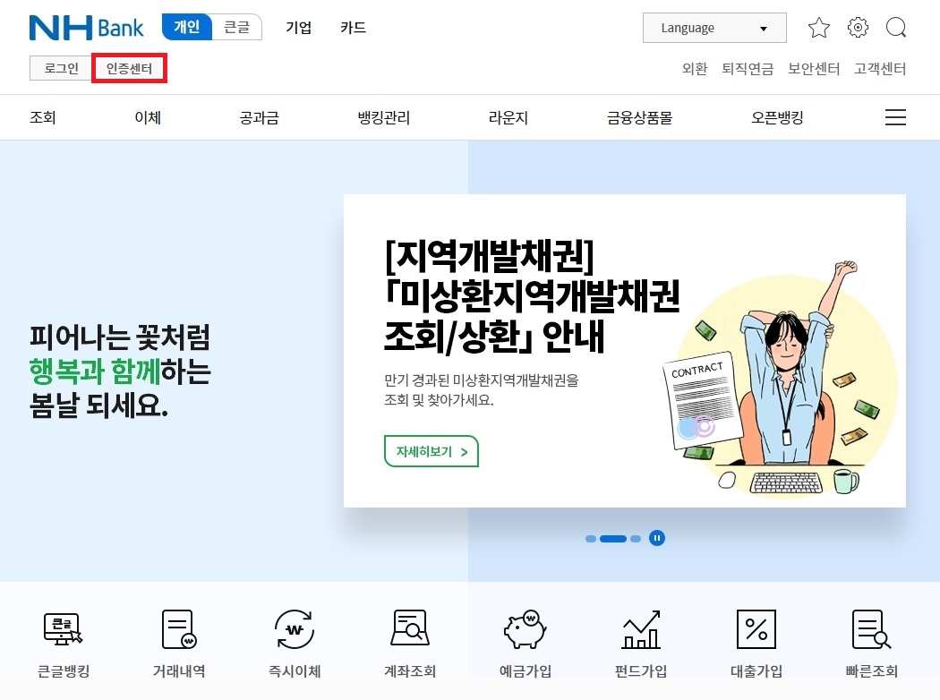 방법은 그렇게 어렵지 않습니다. 농협 인터넷뱅킹 홈페이지에 접속을 먼저 해주신 후에 진행을 해주시는건데요. 로그인 메뉴 오른쪽에 인증센터라는 메뉴가 있습니다.