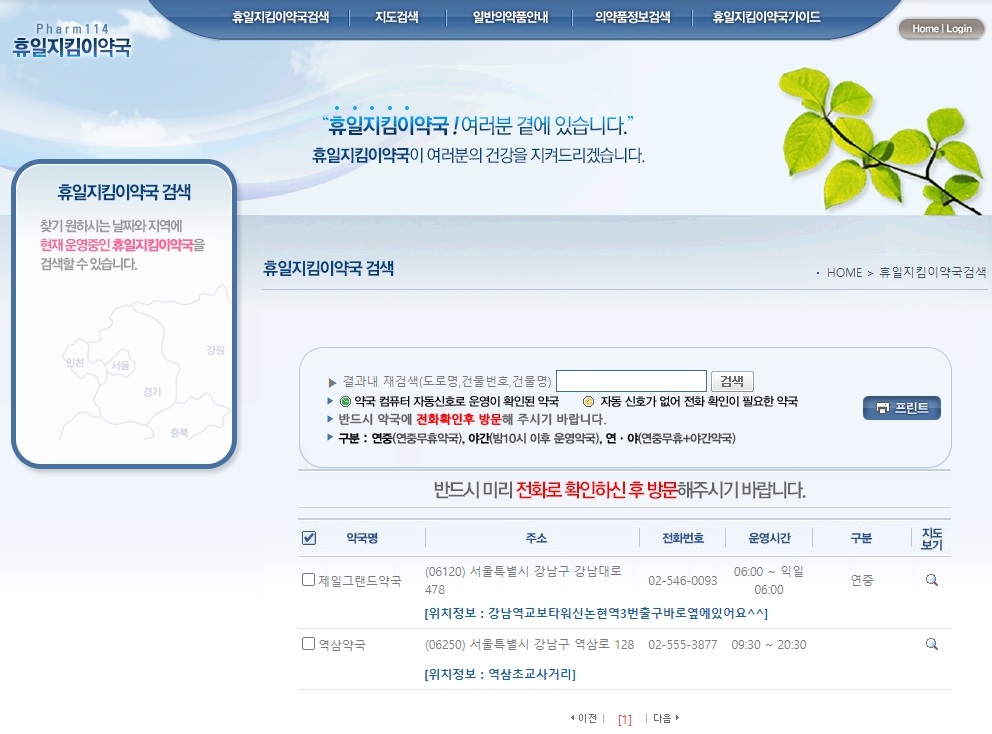 지금 보시는 사진은 휴일지킴이약국이라고 하는 홈페이지인데요. 여기에서 약국 운영시간에 대해서 확인을 하실 수 있습니다.