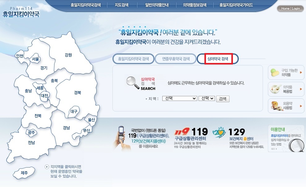 메뉴 중 심야약국 검색을 눌러주세요.