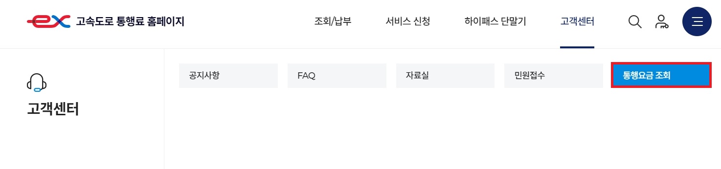 이곳이 바로 고속도로 통행료 홈페이지인데요. 상단에 있는 고객센터 메뉴를 눌러주세요.