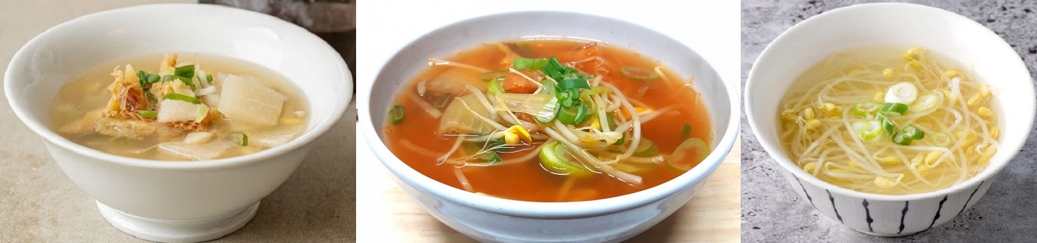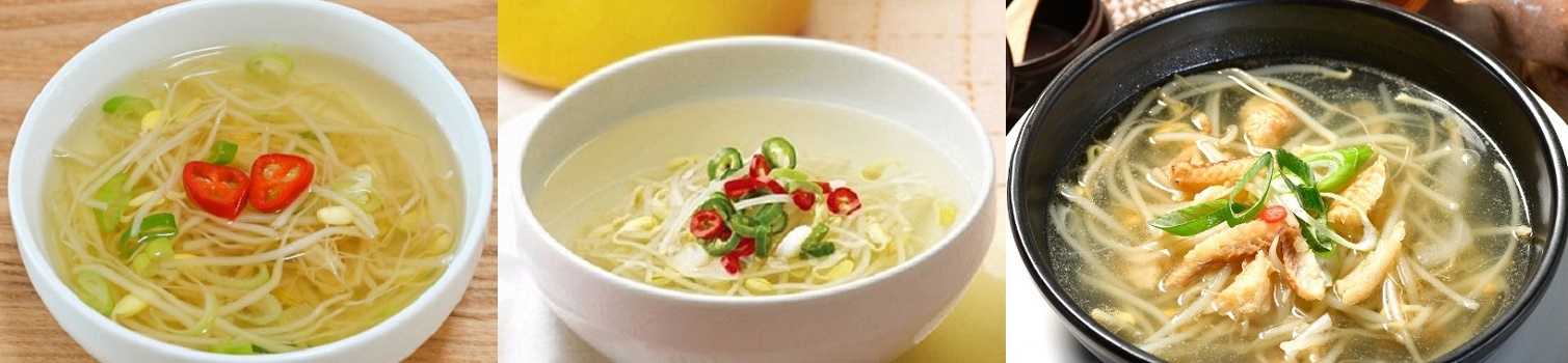 1. 맑은 콩나물국 : 콩나물, 다진 파, 멸치 다시다 육수, 다진마늘, 국간장, 멸치액젓, 소금