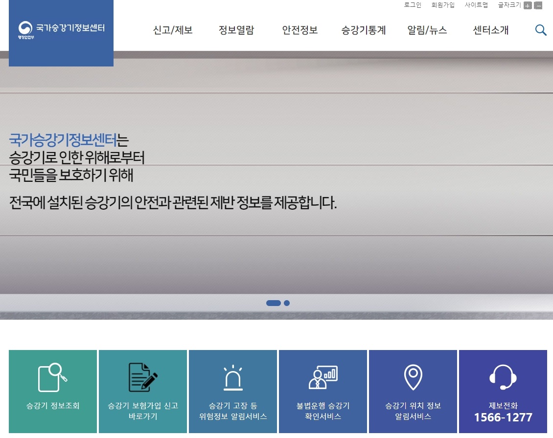 바로 이곳이 여러분들이 찾으시는 홈페이지에요. 여기에서는 승강기에 관련이 된 다양한 정보를 확인 및 제공받을 수 있습니다.