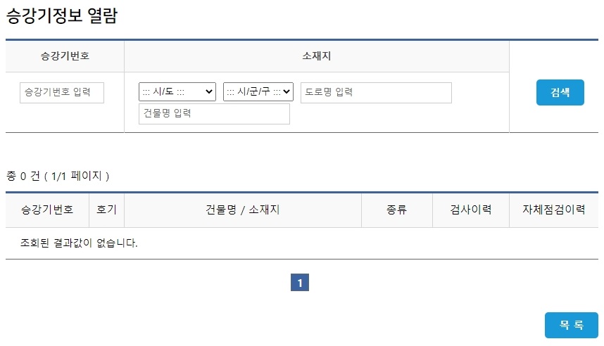 이런식으로 승강기 번호를 입력하시면 승강기정보 열람도 가능하게 되어 있어요.